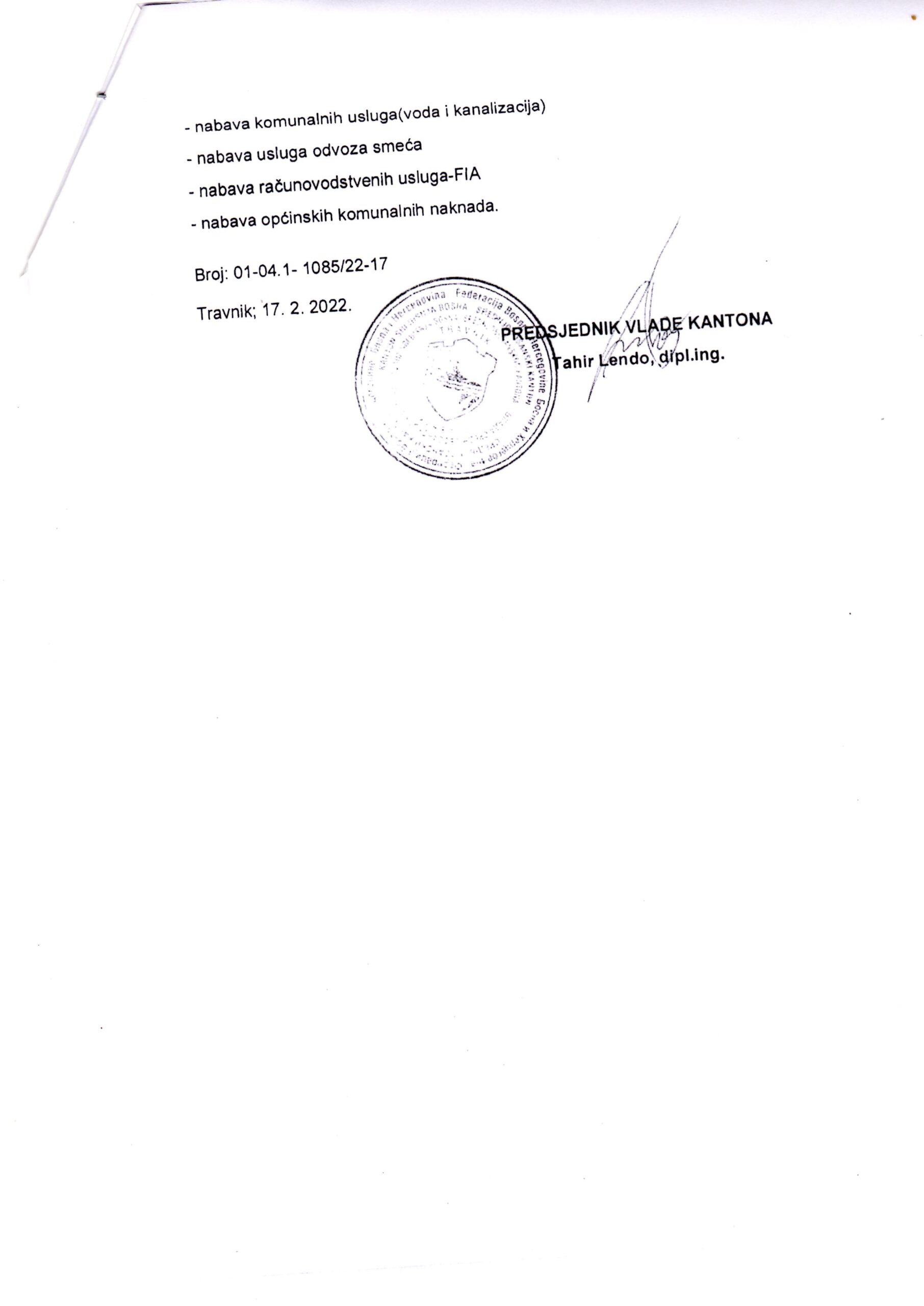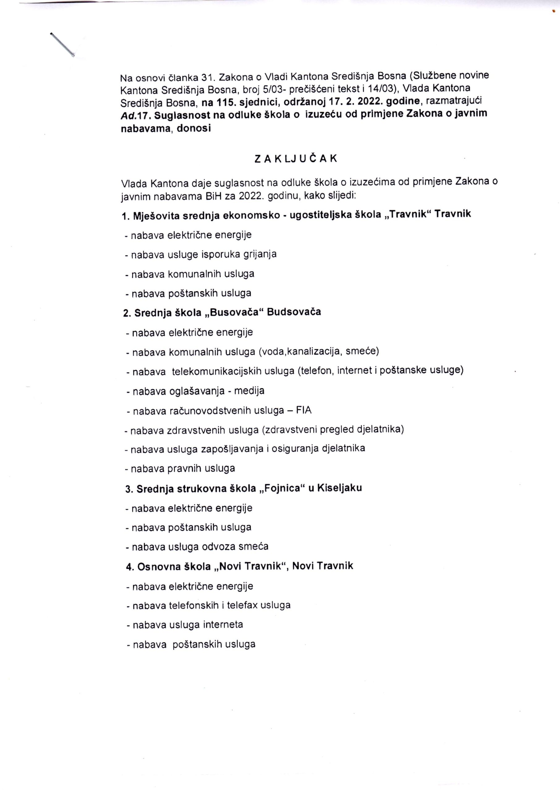 ZAKLJUČAK o izuzećima od primjene Zakona o javnim nabavama BiH za 2022.godinu